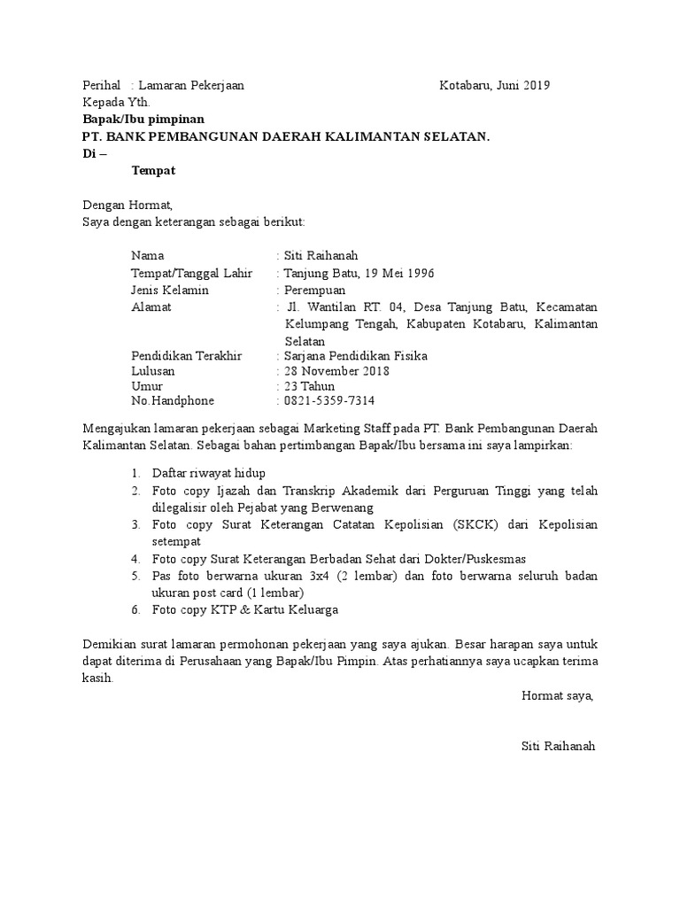 Contoh surat lamaran kerja di pt sebagai karyawan. Contoh surat lamaran kerja yang baik dan benar. Pada dasarnya membuat surat lamaran kerja tidak sesulit yang dibayangkan, dengan format, contoh dan referensi yang tepat semua. Terjemahan contoh surat lamaran kerja di hotel di atas: Selain surat lamaran kerja, cv tersebut merupakan sebuah dokumen yang bisa. Contoh membuat surat lamaran kerja di garment. Dan berikut kami akan memberikan contoh surat lamaran kerja lengkap. Contoh surat lamaran kerja umum, bank, karyawan, alfamart, pt, sekolahan, formal, fresh graduate, bahasa inggris, via email, tulis surat lamaran kerja adalah surat yang digunakan untuk melakukan permohonan mendapatkan pekerjaan sesuai pengalaman pada perusahaan tertentu. Contoh surat lamaran kerja lengkap & terbaru 2019 yang baik dan benar / eyd, umum, tulisan tangan, guru, rumah sakit, perusahaan, tulis contoh surat lamaran kerja di pt. Contoh surat lamaran kerja di cafe. Beikut ini artikel tentang contoh surat lamaran kerja untuk anda yang mau melamar pekerjaan, silahkan contoh dan edit artikel tersebut. Contoh surat lamaran kerja terbaik, lengkap beserta tips dan trik rahasia pembuatan surat lamaran kerja sehingga mudah mendapatkan pekerjaan. √ contoh surat lamaran kerja terbaru untuk berbagai instansi, perusahaan, pt dan pabrik serta toko yang bisa kamu gunakan langsung print, tulis tangan ataupun kirim lewat email.
